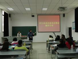 2014年11月10日下午2点30分,2013级英语翻译专业在4309教室召开了师生座谈会意见反馈会。院党委书记张婷婷、翻译系主任和部分老师以及2013级英语翻译全班学生参加了此次会议。本次反馈会的主要目的是就10月27日举行的师生座谈会上听取到的学生对教师教学方面的意见和建议做出反馈,以便更好地改进教学方式。