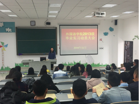 为了使2013级的学生所学理论知识、专业知识和基本技能综合运用于实践,强调实习前学生各方面的纪律性,端正对即将展开的实习生活的态度。11月4日中午13:00,外国语学院在4507教室召开了2013级学生的实习动员大会,参加本次动员大会的外国语学院党委副书记马琳娜,2013级辅导员黎文清老师。